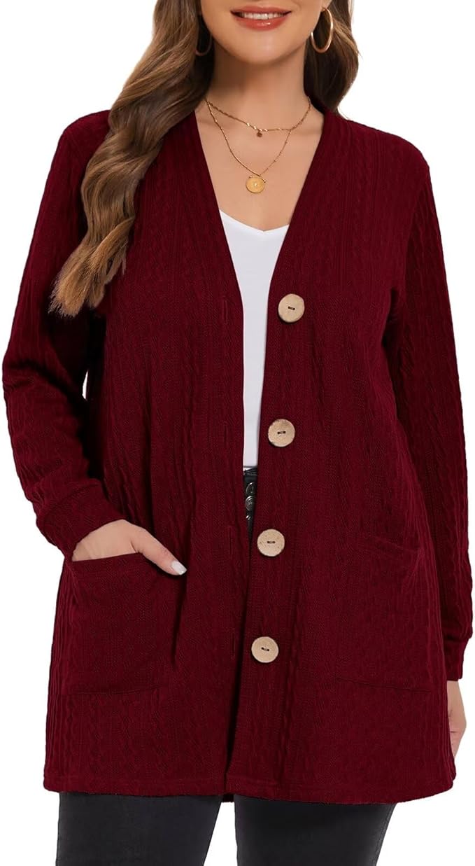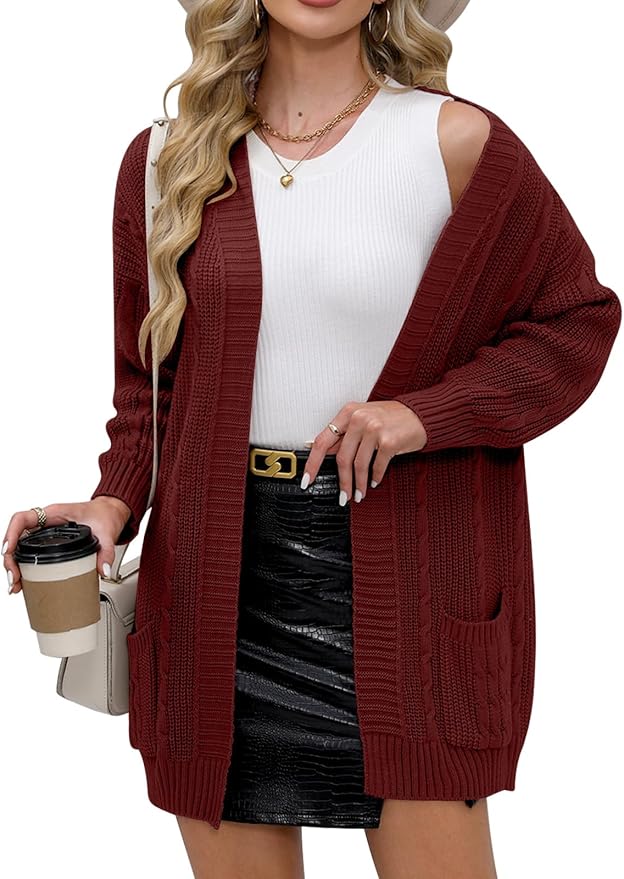 Open Front Cardigan for Women Cable Knit Sweater with Pockets Plus Size Long Sleeve Tops Button Down Winter Coat