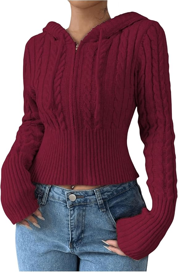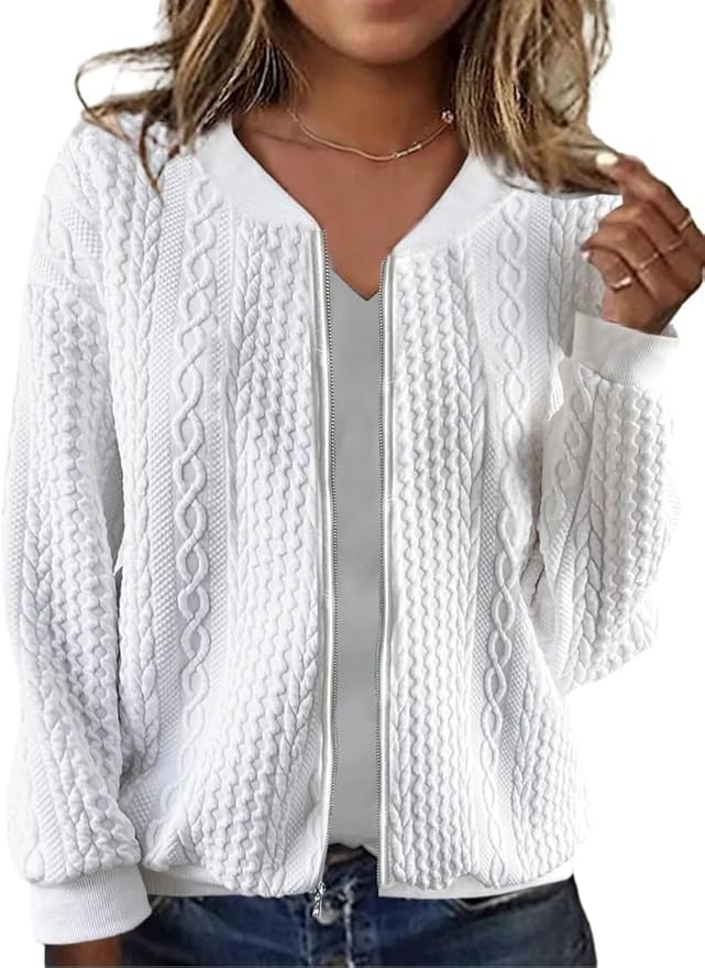 Women's Zip Up Cardigan Sweater Cable Hoodies Long Sleeve Jacket Outfits Crewneck Casual Coat