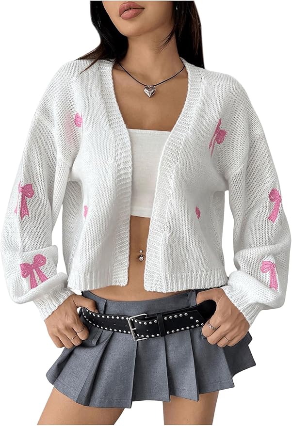 Women's Bow Sweater Cardigan Open Front Cable Knit Lantern Sleeve Cropped Cardigan