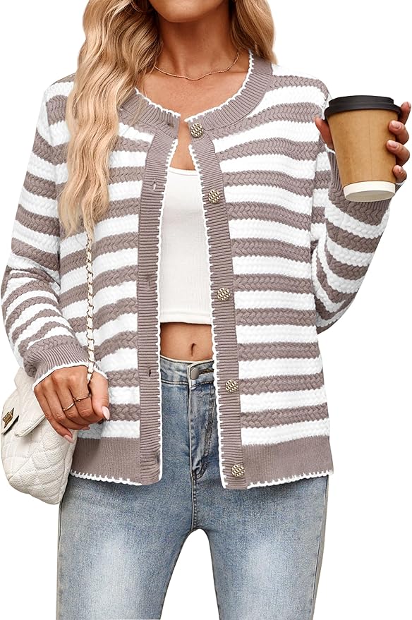 Women's Long Sleeve Striped Cardigan Sweaters Button Down Cable Knit 2024 Fall Classy Outwear