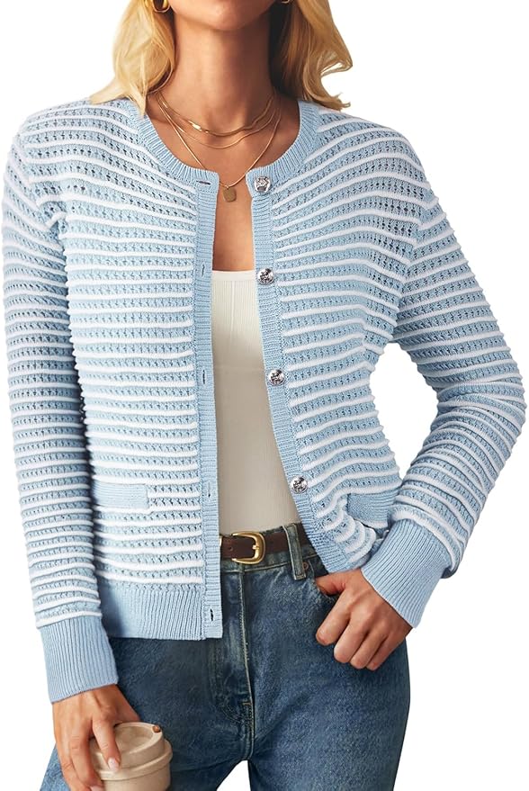 Women's Striped Cardigan Sweaters Open Front Long Sleeve Button Down Casual Cable Knit Jackets Outerwear 2024