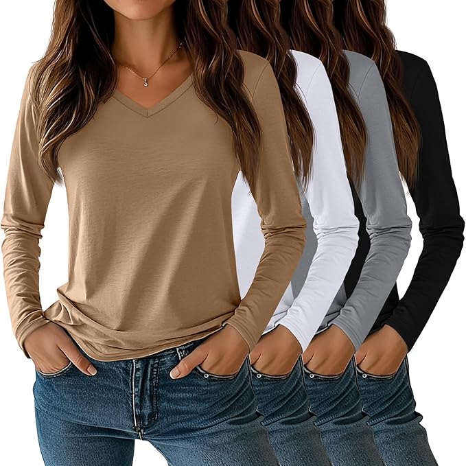 4 Pack Women's V Neck Shirts Long Sleeve Tops Casual Basic Tee Blouse Dressy Fall Fashionable Trendy Outfits 2024