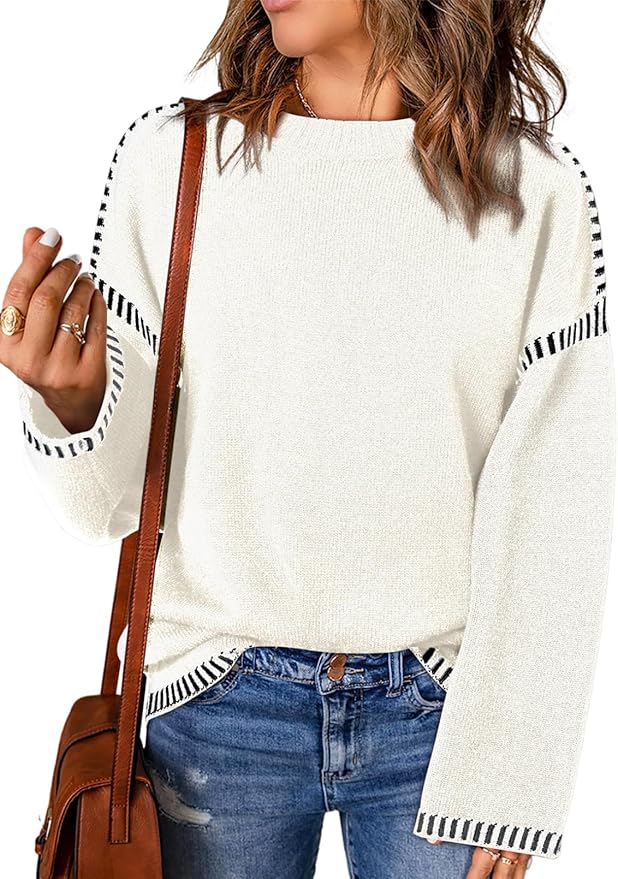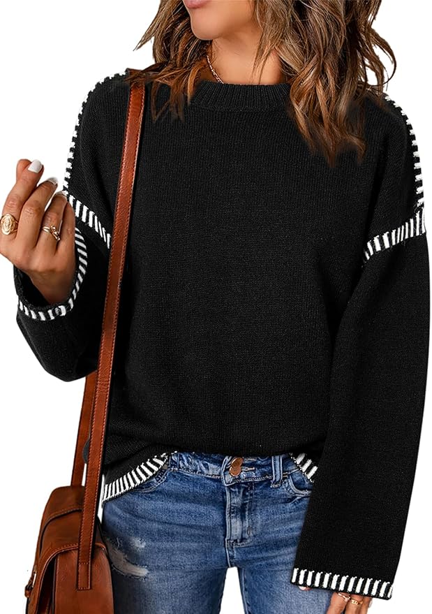 Women's Pullover Sweater Casual Long Sleeve Crew Neck Contrast Color Sweaters 2024 Fall Tops