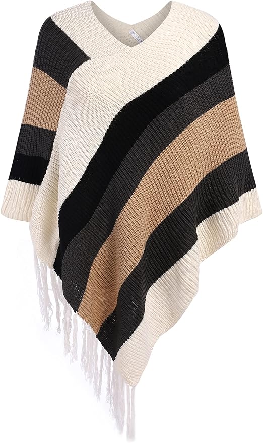 Women's Shawl Wraps Knitted Shawl with Fringed Capelet V-Neck Striped Poncho Sweater Pullover Cape for Women